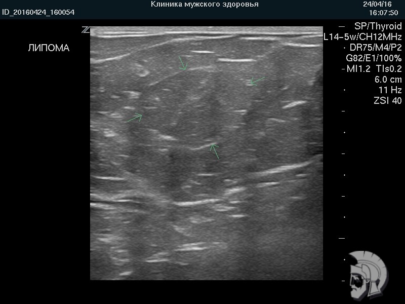 УЗИ груди. Фото липомы у мужчины 23 лет. ЛИПОМА ( «жировик» ) крупного размера представлена образованием тугоэластической консистенции, деформирующим контур груди. Липома указана стрелками |